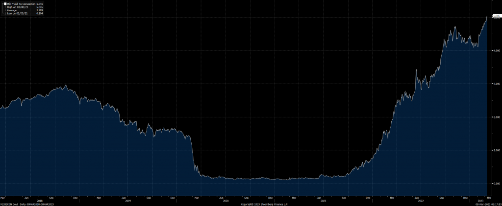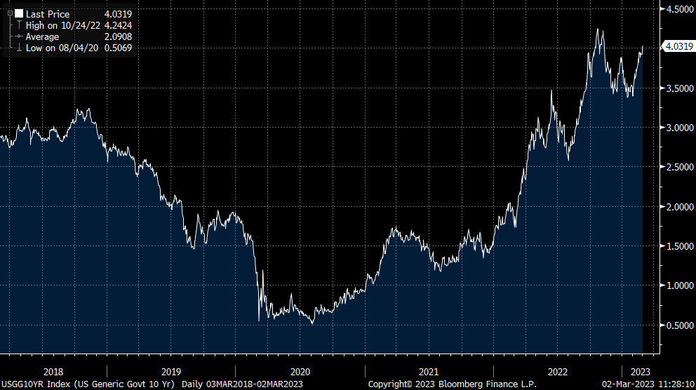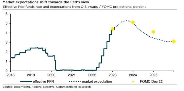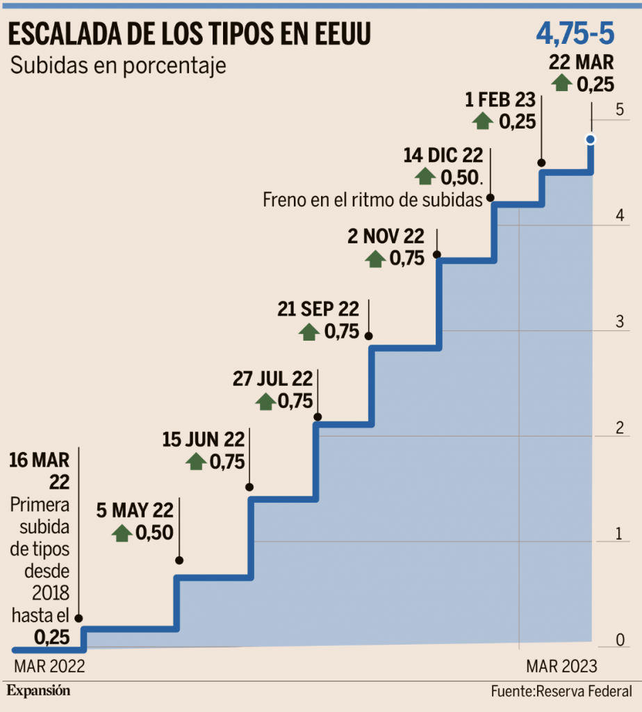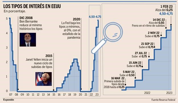 Los buenos datos macroeconómicos en Estados Unidos, +2.9% de crecimiento de PIB en el último trimestre de 2022, ha hecho que la Fed suba un 0,25% adicional los tipos de interés hasta el rango 4.5%-4.75% y hay ya varios analistas previendo que en marzo ya no subirá más.