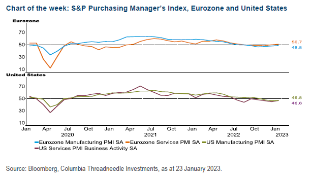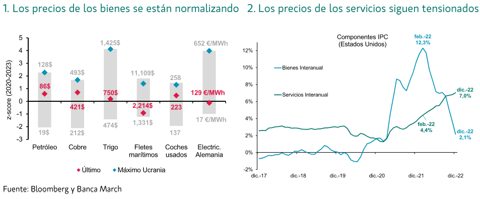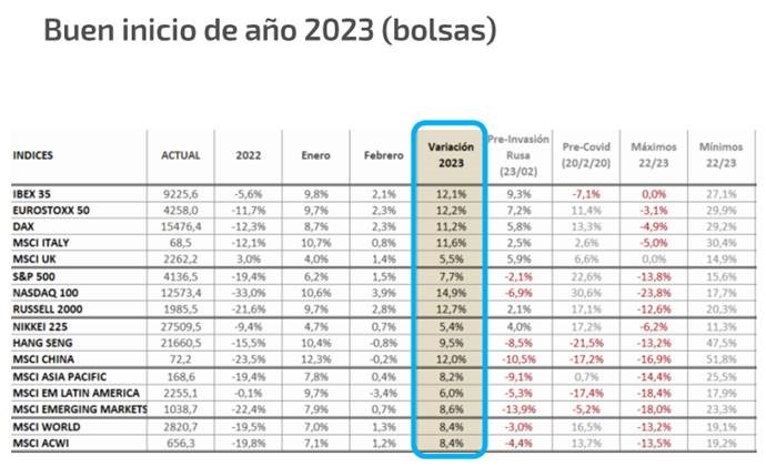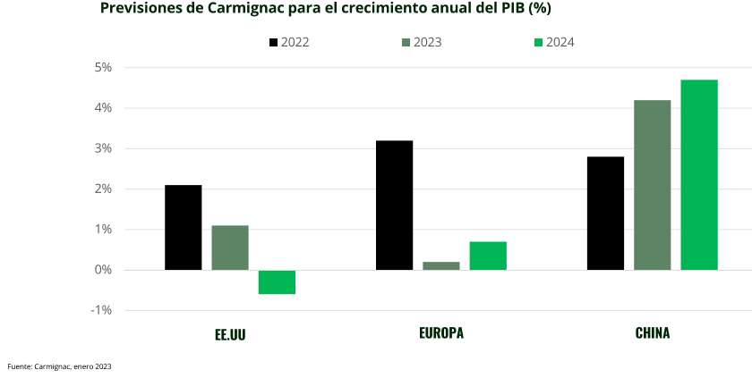 La actualización de las Perspectivas Económicas Mundiales del FMI ofrece una visión algo más optimista del futuro económico. En concreto, se prevé un crecimiento económico mundial del 3,2% entre el cuarto trimestre de 2022 y el mismo periodo de 2023, frente al 1,9% registrado entre los trimestres correspondientes a 2021 y 2022. Esta cifra se situaría por debajo de la media de 2000-2019, del 3,8%. Sin embargo, dada la enorme volatilidad y los repuntes de la inflación, sería un buen resultado.
