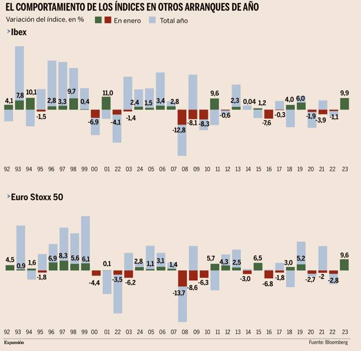 Hay un aforismo bursátil que reza: Enero alcista, año alcista. En el caso del Ibex, por ejemplo, en las tres últimas décadas el 58% de los eneros ha terminado con revalorizaciones. Pero no siempre ha logrado cerrar ese año también en positivo. Lo ha conseguido en 12 de los 18 años de eneros alcistas.