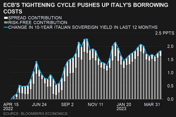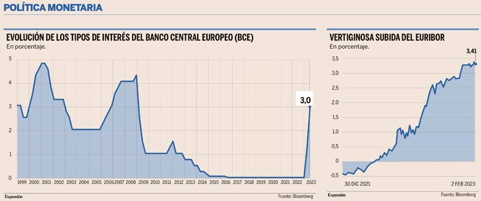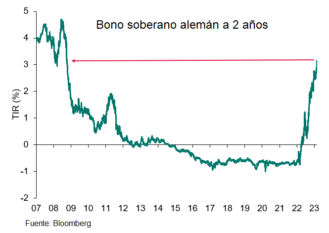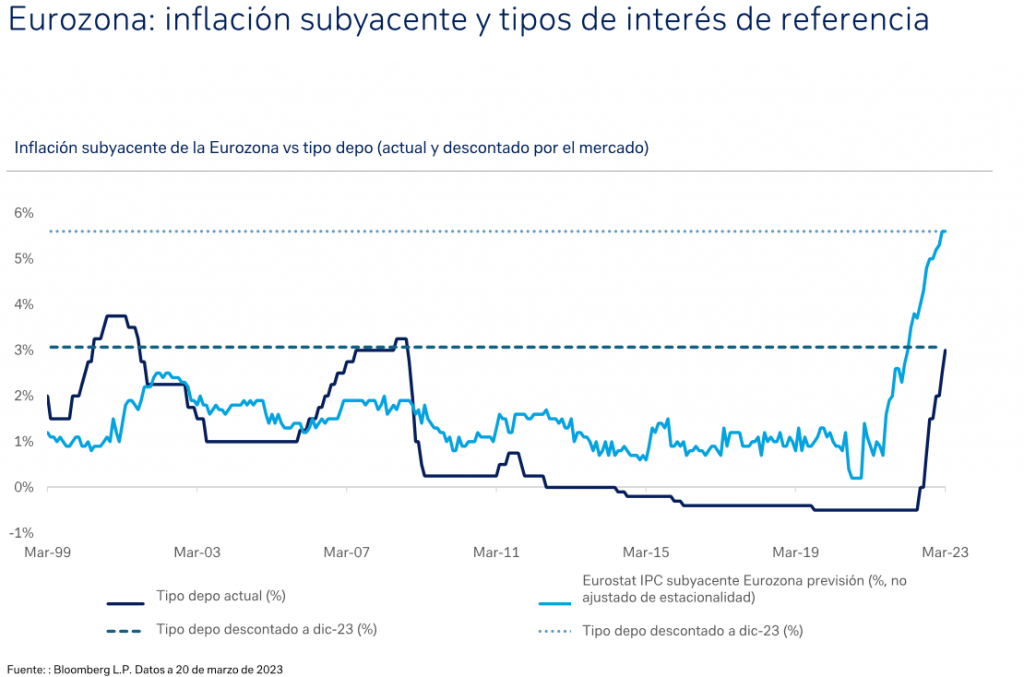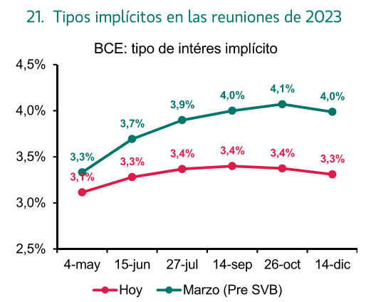 Esas cifras muestran que aún queda un largo recorrido en ese túnel de las alza de los tipos de interés, que de seguro se aproximarán mucho al 4%, un nivel que hace tan sólo un mes tanta conmoción causó entre los inversores. Aunque el crecimiento de los precios evolucione de forma favorable, los mercados deberán digerir al menos una subida más de 50 puntos básicos y un mínimo de otra más (seguramente dos) de 25 puntos básicos.