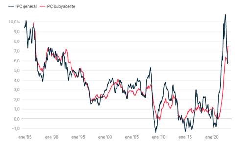 El lunes se publicó el dato de IPC en España. La balanza de la inflación ha vuelto a decantarse en España del lado de las subidas, evidenciando que la amenaza alcista de los precios, el gran quebradero de cabeza de los gobiernos y de los bancos centrales a lo largo de 2022, aún no se ha conjurado. Tras cinco meses de moderación en el ritmo de subidas, el índice de precios de consumo (IPC) ha retomado en enero su escalada, aupándose hasta el 5,8% interanual, una décima más que en diciembre. Y lo que es aún peor, la inflación subyacente, que excluye los elementos más volátiles, como la energía y los alimentos frescos y, por tanto, refleja el componente más estructural de la subida de precios, sigue en ascenso, catapultándose en enero hasta el 7,5%, cinco décimas más que el mes anterior y la tasa más alta en 36 años (desde 1986).