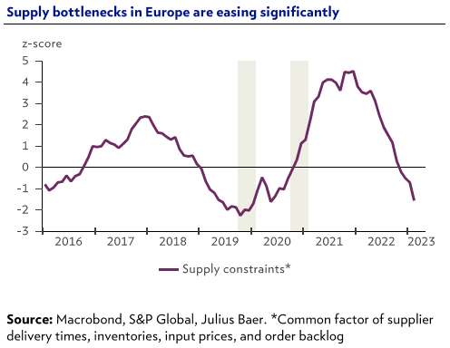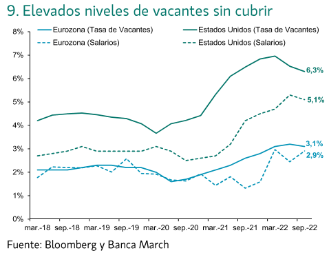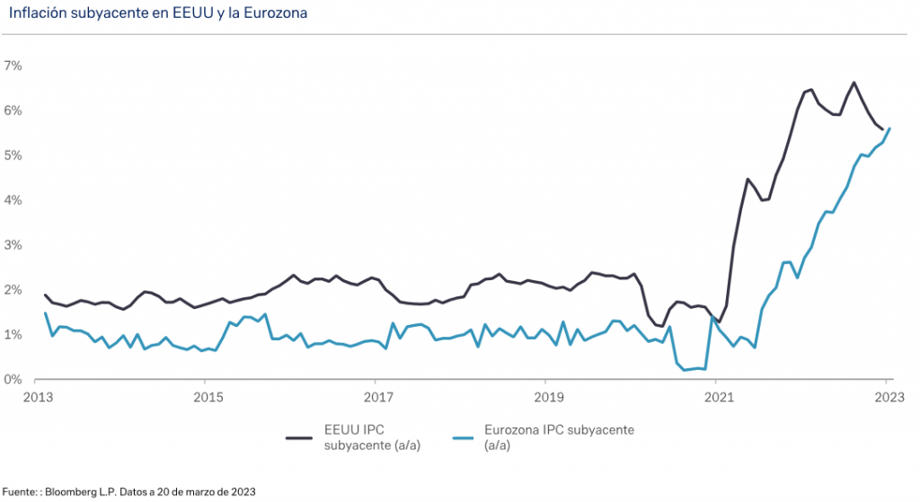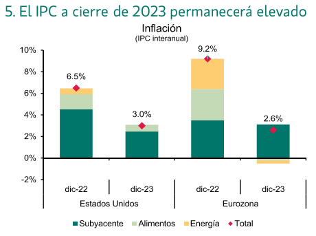 Algunos podrían pensar que se están subestimando los riesgos a la baja para el crecimiento en los países de renta alta: los consumidores podrían retraerse, al agotarse las ayudas que recibieron en pandemia. Sin embargo, el riesgo opuesto es que la fortaleza de las economías impida que la inflación descienda hasta el objetivo del 2% con la suficiente celeridad. La inflación general podría haber sobrepasado su nivel máximo.