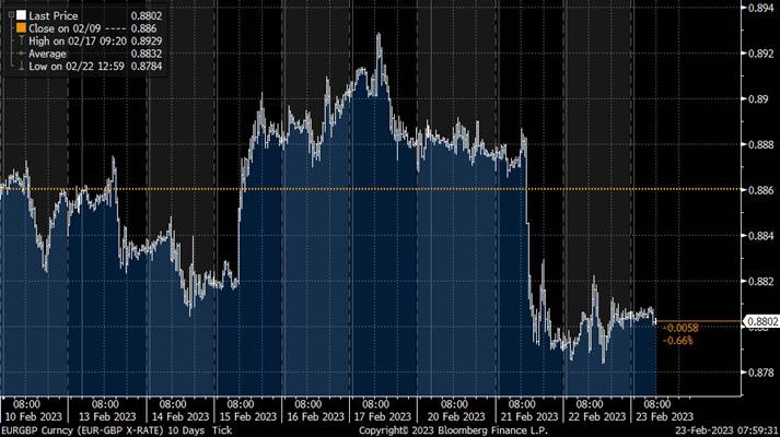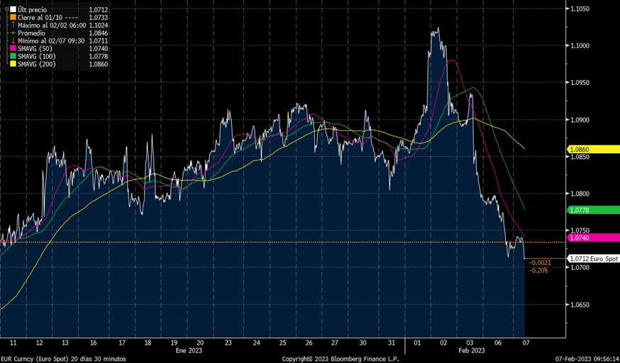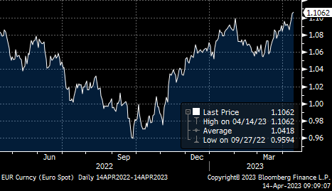 Se mantiene el positivo tono en el mercado, los mercados asiáticos han cerrado esta noche en máximos de los últimos dos meses, tras unos datos de precios industriales a la baja y de subsidios de desempleo al alza en Estados Unidos. Se descuenta que la Fed girará su política monetaria, en contraste con la necesidad en la Eurozona de seguir elevando tipos ante una inflación subyacente todavía al alza. Esta semana han pesado claramente las declaraciones hawkish de varias personalidades del BCE, entre las que destacan las palabras de De Guindos del miércoles planteando que la inflación subyacente se estaba mostrando más persistente de lo inicialmente pensado, lo que, al menos en teoría, abriría la puerta a ver subidas de tipos más agresivas. De esta manera, los mercados volvieron a poner en precio un nivel de llegada superior al 3,50% que se había barajado hasta el momento, trasladando registros ligeramente por encima del 3.60%. En consecuencia, el euro lo capitaliza y supera la barrera de los 1,10 (1,1062 actual).