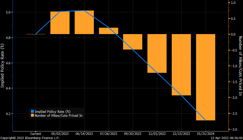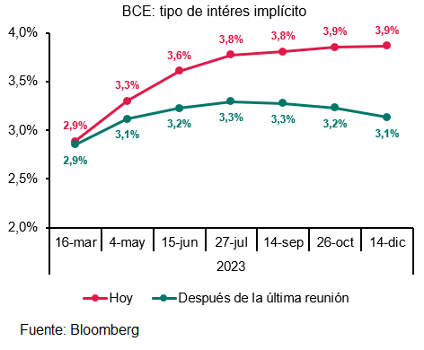 Ayer se publicaron las Actas del BCE en la que se reflejó que varios miembros se mostrasen preocupados ante unas estimaciones de inflación demasiado benignas. Las últimas previsiones del BCE, fijadas antes de los eventos de SVB y Credit Suisse, contemplaban una aceleración del crecimiento hacia su nivel potencial a principios de 2024, con ralentización de salarios y moderación gradual de la inflación hacia su objetivo del 2%. Este escenario no parece muy factible, y de hecho varios miembros aprecian riesgo al alza sobre las previsiones de inflación hasta 2025 (2%), con creciente división en el seno del BCE respecto a dónde se tienen que situar los tipos de interés. Por el momento, el mercado está dividido en torno a la cuantía de la subida de tipos en la reunión del 4 de Mayo, entre 25 y 50 puntos básicos, y sitúa el nivel de llegada del tipo de depósito en 3,75% frente al 3% actual.
