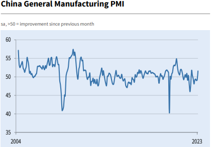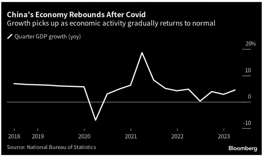 El martes se publicaron datos de crecimiento de enChina que muestran la positiva evolución de su economíatras poner fin a la política Covid cero, se publicó un dato de PIB del 1T23 +2,2% trimestral frente al +0,6% anterior, +4,5% interanual frente al +2,9% previo, aunque la mejora se produce sobre todo en consumo, que subió un +10,6%, mayor subida desde Junio del 2021, y no tanto en manufacturas ni en inmobiliario.