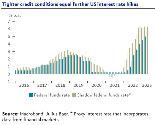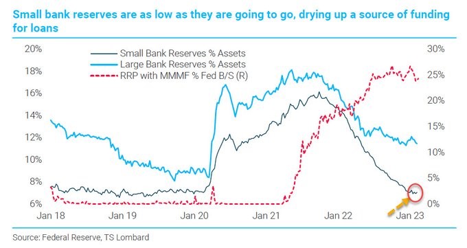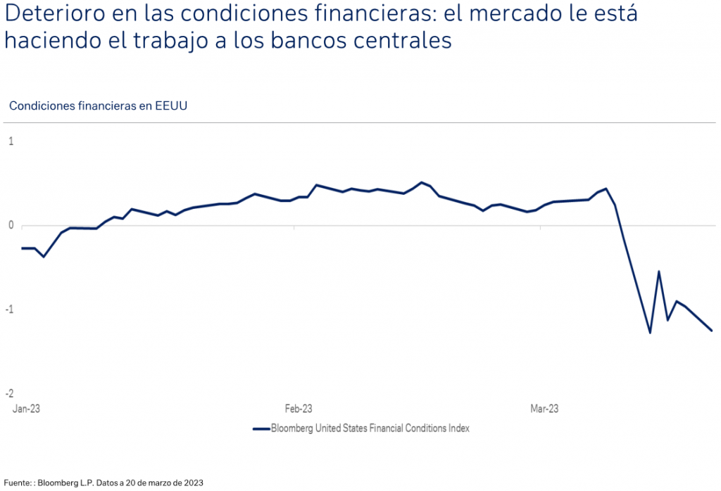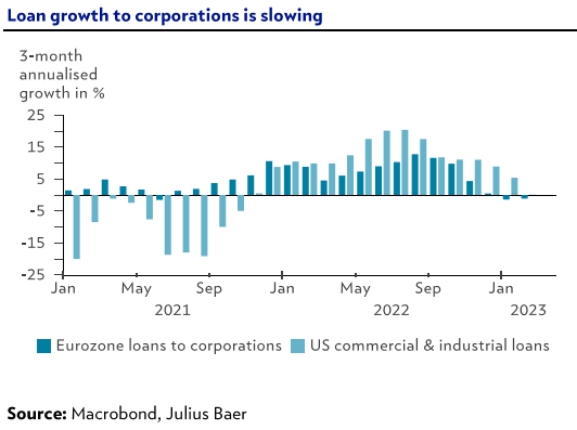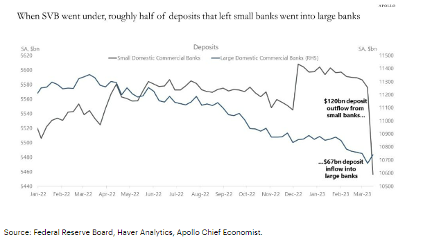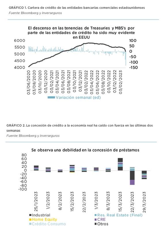 Los bancos más pequeños han sufrido importantes salidas de depósitos hacia sus rivales más grandes, los fondos del mercado monetario y, en mucha menor medida, el espacio de las criptomonedas. Es poco probable que esto se invierta por completo a corto plazo. En cambio, forzará un ajuste por parte de unas instituciones que son grandes proveedores de préstamos a pequeñas y medianas empresas, así como de hipotecas. Como es poco probable que los beneficiarios de las salidas de depósitos lleven a cabo este tipo de actividades a cualquier escala, el crédito a todo el sistema se contraerá.
