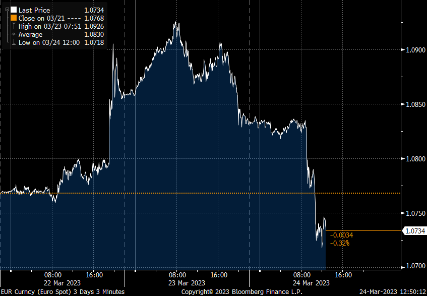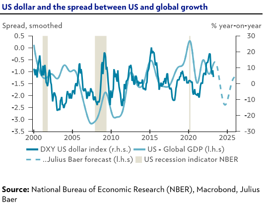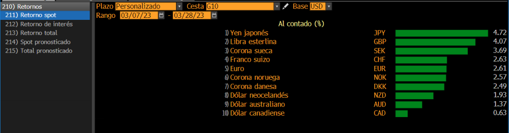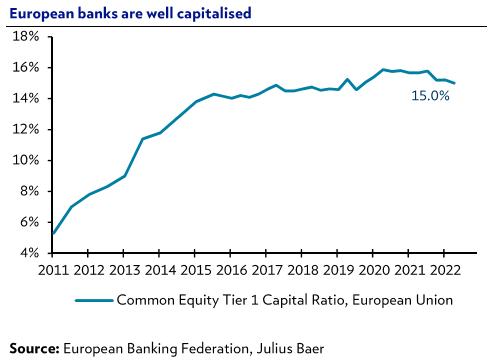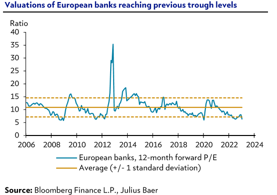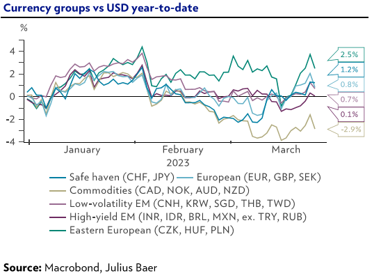 Esta semana Julius Bäer publicaba su estrategia mensual en la que no esperan subidas de tipos de interés por parte de la Fed, mientras que el Banco Central Europeo aún va a tener que seguir subiendo, lo que sumado a la fragilidad mostrada por el sector financiero estadounidense resta soporte fundamental al dólar según los analistas de JB y abre la puerta a una mayor depreciación. Julius Bäer ha revisado su estimación a 3 meses del dólar al 1,12 dólares por euro desde el 1,10 anterior.