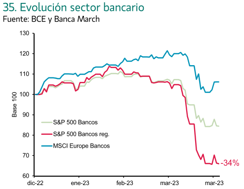 Estos últimos días hemos estado viendo una recuperación del sector financiero en Bolsa, ya que no parece que la crisis vivida vaya a tener mayores consecuencias, o eso afirman la mayoría de los analistas, el sector disfruta de un enorme aumento de sus márgenes, gracias a las subidas de tipos, capaz de compensar sobradamente un eventual aumento de los costes de los depósitos, bonos subordinados y convertibles, así como un fuerte repunte del coste del riesgo por morosidad. Fuera de la Bolsa, la situación es mucho menos visceral. El indicador compuesto de estrés sistémico del BCE está en 0,4 sobre 1, por debajo del año pasado. Algo parecido sucede con el diferencial medio de la deuda bancaria subordinada.