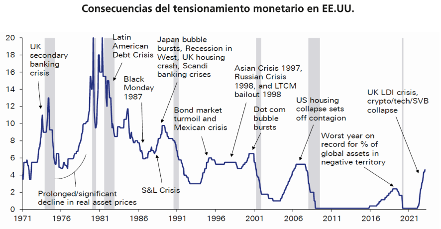 En primer lugar, la autoridad monetaria sube con fuerza el precio del dinero para dar un golpe sobre la mesa y refrendar su credibilidad. Después, con la emergencia algo más controlada, va poco a poco reduciendo el ritmo de sus intervenciones. Finalmente, opta por frenar y mantener las tasas habiendo alcanzado el pico.