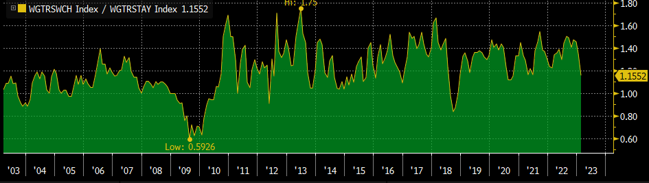 Esta semana Bloomberg publicaba un informe sobre sus expectativas de subidas de tipos, los analistas de Bloomberg creen que el Banco de Inglaterra ya ha terminado con su ciclo de subidas de tipos, aunque hay un cierto riesgo a que suba unos últimos 25 puntos básicos en Mayo. Para el Banco Central Europeo estiman que suba tipos en Mayo y en Junio. Bloomberg estima que el tipo neutral del Banco de Inglaterra (tipo que mantiene la economía creciendo con la inflación en su nivel objetivo) ha subido al 1,50% desde el 0,70% de comienzos del 2021. Para el BCE Bloomberg considera que el tipo de neutralidad ha subido al 1,1% desde el 0,60% del 2021. En una encuesta de Reuters de esta semana, los analistas descuentan una subida de tipos adicional por parte del Banco de Inglaterra.