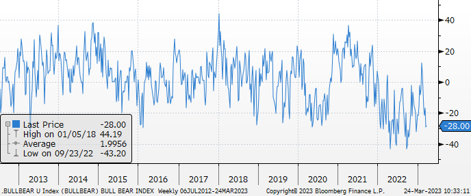 Es noticia también ver cómo algunos indicadores importantes de volatilidad como son el VIX Index dan sus lecturas más bajas del año, último 16,95, y hay bastante consenso sobre el que la volatilidad pudiera estar en descenso en estos momentos. De ser cierto cabría pensar que lo peor de la crisis financiera y de la política monetaria contractiva habría pasado ya. Estas medidas de volatilidad junto con el estrechamiento de los diferenciales de crédito hacen que muchos inversores permanezcan en estado más cauto, por lo menos en lo que a Renta Fija se refiere. De hecho para muchos inversores que estos indicadores estén a estos niveles apuntan a corrección táctica de mercado en el corto plazo. Tanto el VIX como el VSTOXX están a la parte baja de rango de los últimos 10 años, y el porcentaje de valores del EuroStoxx 50 por encima de la media de las últimas 200 sesiones se acerca al 100% (96%), otro indicador que suele adelantar una corrección de las Bolsas.