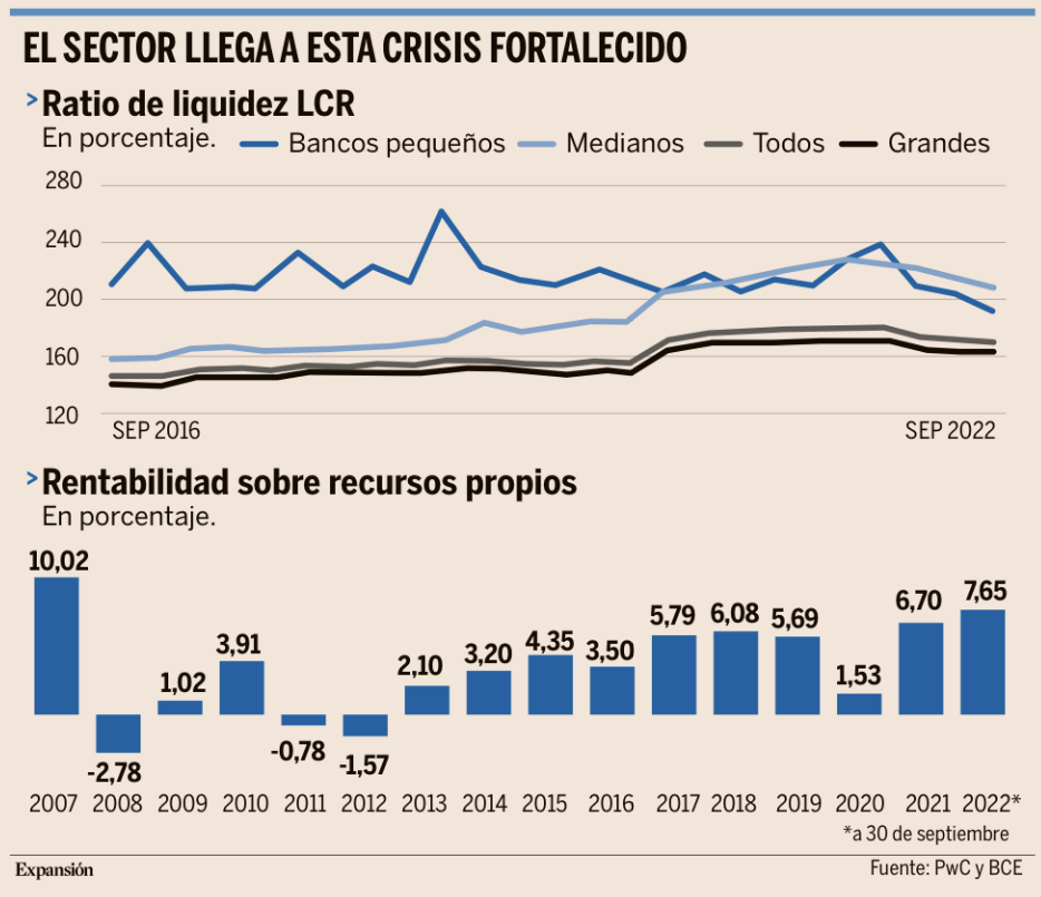 En términos de capital total, el promedio exigido para 2023 es el más alto de la historia reciente, según PwC.Otro tanto sucede con las ratios de liquidez. La normativa obliga a reportar una ratio LCR mínima del 100%. Es decir, a tener una cuantía de activos líquidos (o susceptibles de ser convertidos rápidamente en liquidez) suficiente como para absorber una fuga de depósitos fuerte y continua durante 30 días consecutivos.