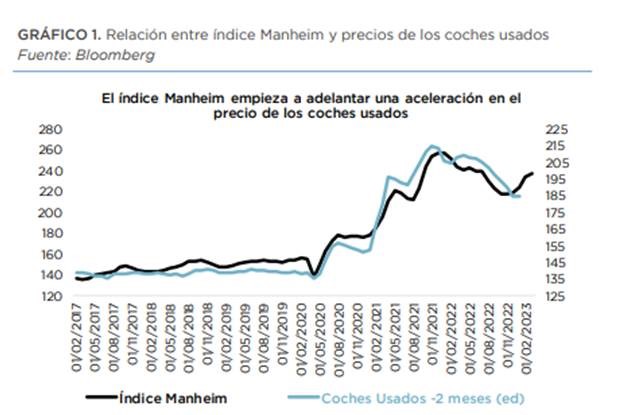 El viernes de la semana pasada se publicó el informe de empleo estadounidense, el cual, pese a trasladar una cierta ralentización en el nivel de contratación, continuó mostrando un entorno netamente tensionado en términos generales, con una tasa de paro en el 3.5%. Es altamente probable que el contexto laboral en Estados Unidos suponga un paso más que afiance a la Fed en su necesidad de seguir subiendo tipos en mayor medida, aunque, por el momento, el mercado no parece estar muy de acuerdo con esta idea y no sólo no está poniendo en precio el nivel de llegada del 5,25% que planteó la Autoridad Monetaria en la publicación de sus “dots” en marzo, sino que sigue apostando de manera indisimulada por recortes en la segunda parte del año. En este sentido, la publicación del IPC de marzo será especialmente relevante, ya que cualquier paso expansivo en esta materia debe de ir precedido por una ralentización clara y evidente de los precios en la economía estadounidense. El dato subyacente podría experimentar una aceleración de cierto calibre después de que elementos que hasta hace poco planteaban un entorno incluso deflacionista como puede ser el caso de los coches usados, parece que puede comenzar a revertir esta dinámica, tal y como muestra la evolución del índice Manheim que trata de medir, precisamente, este extremo.
