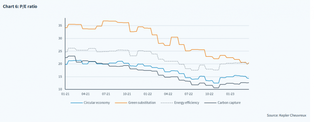 PER 2024 esperado S&P Global Clean Energy Index (linea verde) y MSCI World (blanca)