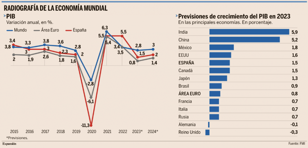 Según el Fondo, los riesgos siguen siendo a la baja. En realidad, los riesgos adversos se han moderado desde octubre de 2022. En el lado positivo, podría haber una demanda más fuerte o una inflación más baja de lo esperado. En el lado negativo, existen riesgos de posibles rebrotes por Covid en China, un repentino aumento de las tensiones en la guerra en Ucrania o turbulencias financieras. A esto podrían unirse otros focos de tensión, no sólo en Taiwán, sino también el riesgo de un ataque al programa de armas nucleares de Irán que, a su vez, podría derivar en un bombardeo de los yacimientos petrolíferos del Golfo Pérsico.