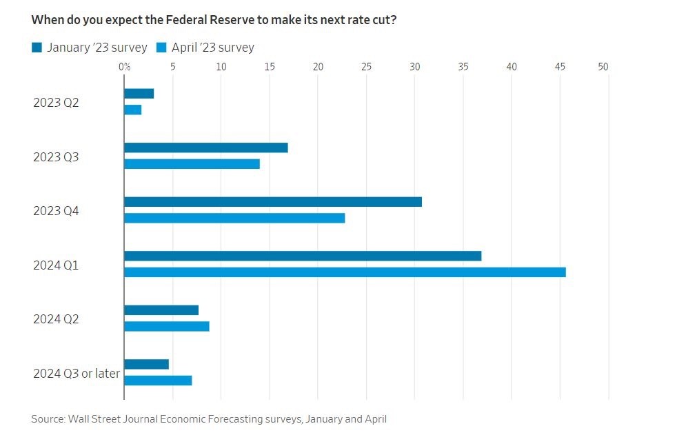 Recientemente publicaba el Wall Street Journal un análisis interesante de como los economistas se han vuelto más pesimistas sobre la inflación, y aunque el IPC americano ha caído al 3,5% este año, 3 de cada 5 economistas no anticipan recorte de tipos en lo que resta de año, tras una subida final de 25 puntos básicos en mayo.