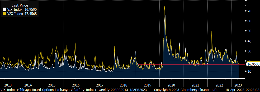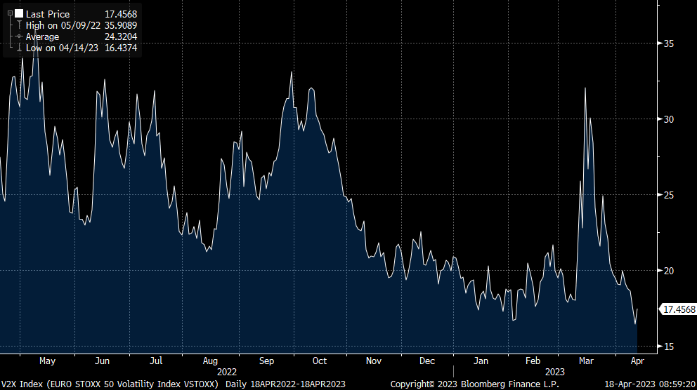 VSTOXX (Volatilidad del EuroStoxx 50) en 2023 (mínimo 16,44 el 14 de Abril).