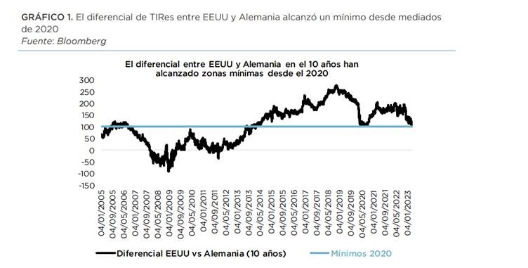 Las expectativas del mercado son que el BCE pueda alcanzar un nivel de tipos del 3,75% mientras que en el caso de la Fed la visión ya está claramente instalada en el 5,25%. La variación llega en la percepción respecto a la estrategia posterior, donde se maneja un contexto de mantenimiento con un cierto sesgo dovish para la Zona Euro, mientras que en Estados Unidos se siguen poniendo en precio las famosas bajadas que han predominado a lo largo de prácticamente todo este año. Esta divergencia puede llegar a explicar buena parte del notable estrechamiento de diferenciales entre Estados Unidos y la Zona Euro, tanto en la parte corta de la curva como en los vencimientos más elevados. De esta manera, en el 10 años el spread ya llegó a tocar los mínimos alcanzados en el 2020