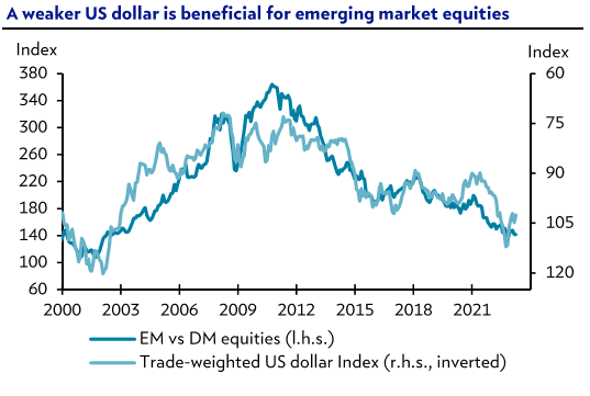 Esta semana hemos estado leyendo varios informes de analistas según los cuales la renta variable emergente se podría ver beneficiada por un dólar sostenidamente débil, en los últimos 20 años la bolsa de mercados emergentes ha subido un 3,4% por cada 1% de depreciación del dólar. Sin embargo, el mayor riesgo de recesión en Estados Unidos y ampliación de diferenciales de crédito podría lastrar esa subida.