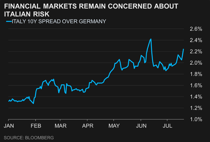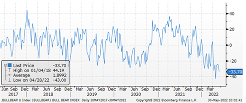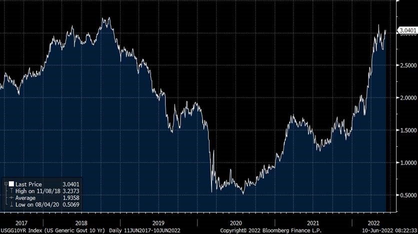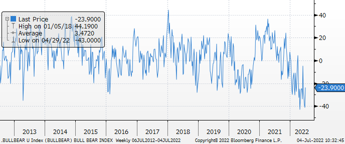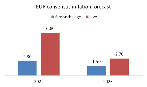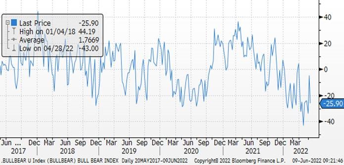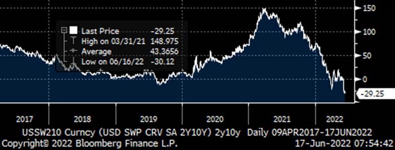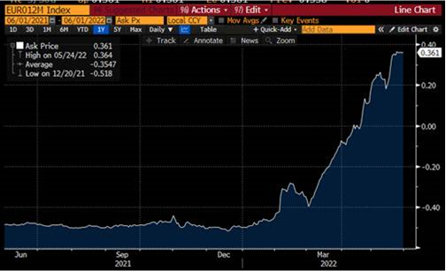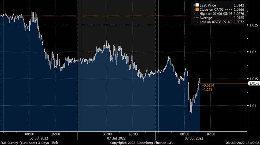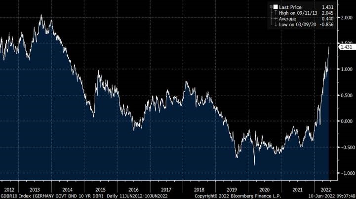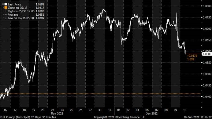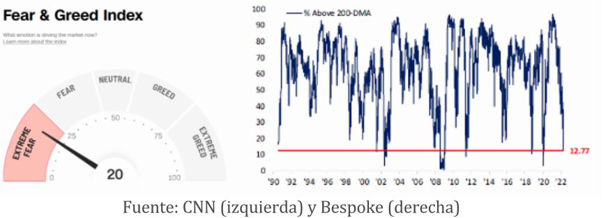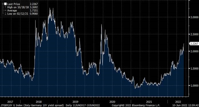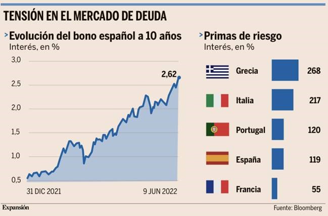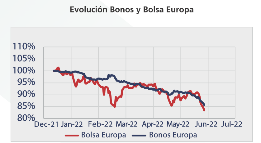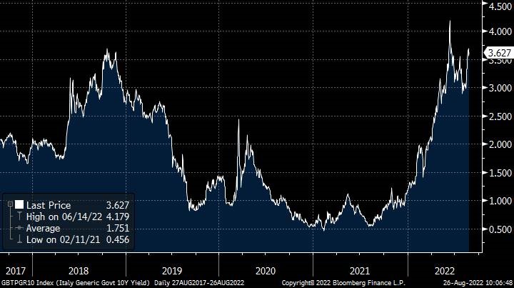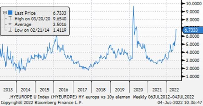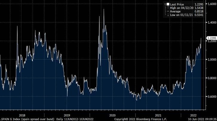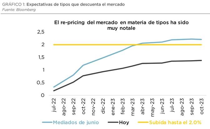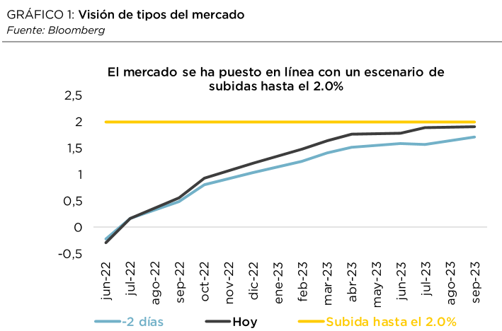 El mercado le da una probabilidad del 60% a que el BCE suba los tipos en 75 puntos básicos en la reunión de la próxima semana, cotizando que alcancen el 2% en Diciembre de este año 2022 (0,5% actual) y el 2,5% en Diciembre del 2023. La consecuencia es la subida de la curva del Euribor (12M +13 puntos básicos hasta el 1,61%), el desplazamiento al alza de la curva alemana (+11 puntos tanto el bono a 2 años, hasta el 1,08%, como el bono a 10 años, hasta el 1,6%). Detrás de este movimiento está la sorpresa por el discurso de Isabel Schnabel, miembro alemán del BCE, que hemos comentado antes donde abogó por endurecer la política monetaria aún en un escenario de recisión. Palabras que han venido acompañadas por varias declaraciones de Gobernadores Nacionales del área euro reclamando contundencia en la subida de tipos.