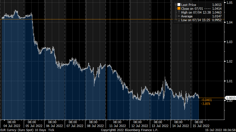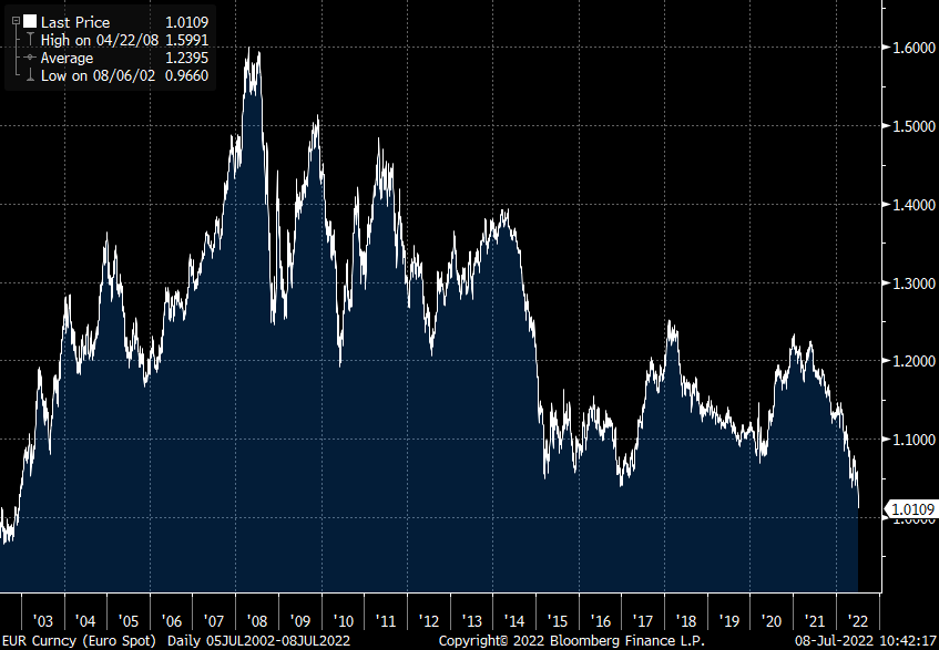 El euro ya ha caído un 15% y está por debajo del valor del dólar el año pasado. Tocó su nivel más bajo en 20 años ante la mayor subida de los precios mayoristas del gas y la electricidad en Europa por los temores a que Rusia estrangule el suministro de energía.