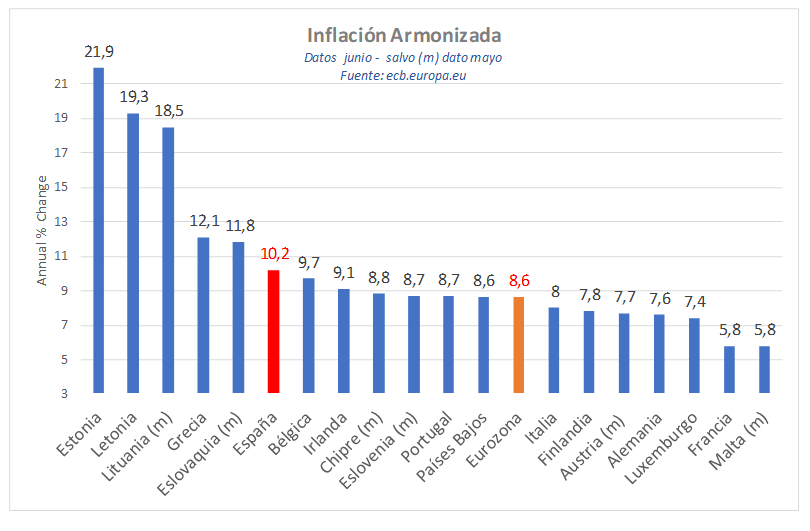Por otra parte, además de por el efecto estadístico, la bajada interanual se produce sólo por el descenso en el precio de los carburantes, que sigue siendo muy alto, pero con importante subida del resto de la energía, de los alimentos, de la restauración y del turismo, elementos, todos ellos, muy importantes en la cesta de productos y servicios del consumidor para su día a día.