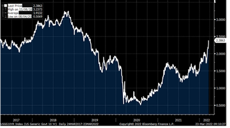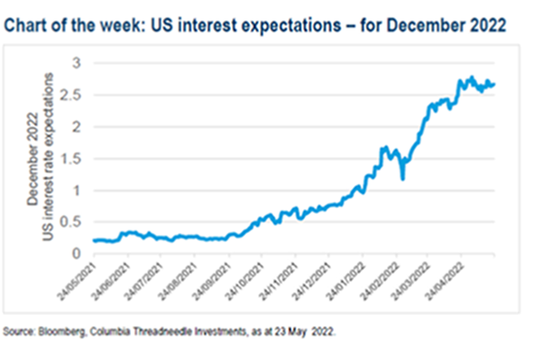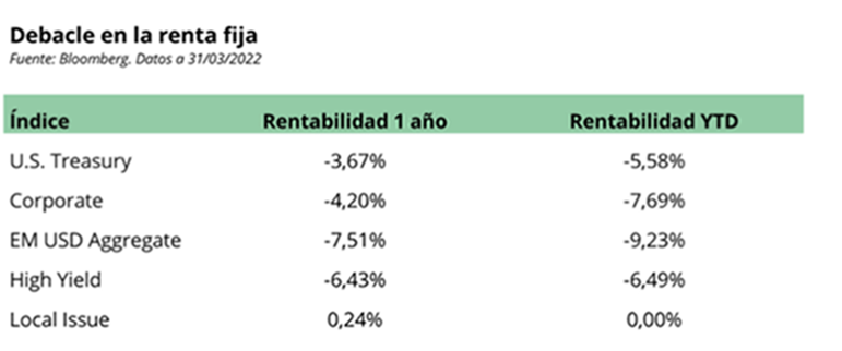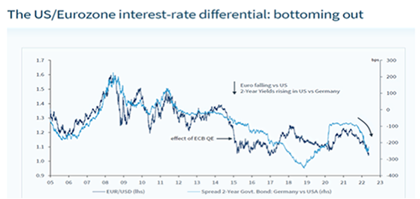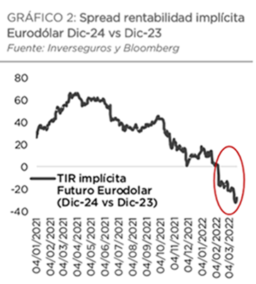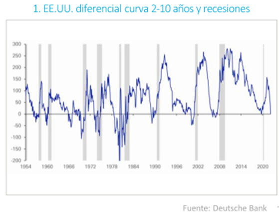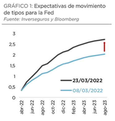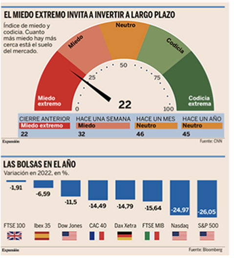 Estas semanas vuelve un poco de sentido común a los mercados y ha vuelto a recuperarse la correlación entre las Bolsas y los bonos, en las últimas dos semanas, las rentabilidades de los bonos soberanos han sido significativamente más bajas a medida que las bolsas han continuado cayendo (S&P -15% en el 2022). Mientras tanto, las expectativas de tipos en Estados Unidos se han mantenido bastante estáticas durante todo el mes en torno al 2,7 % para diciembre de este año.
