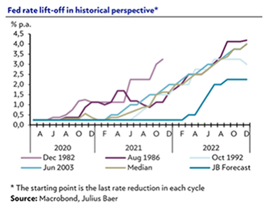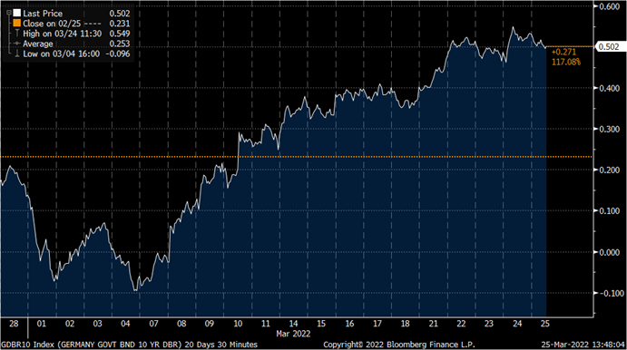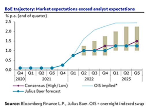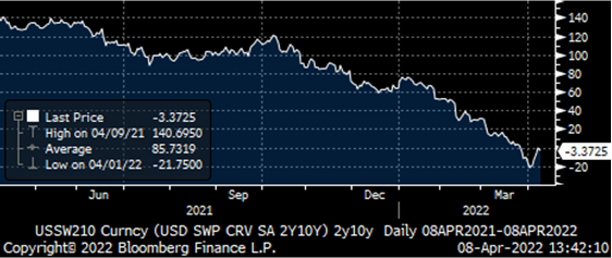 El movimiento más agresivo estos días está siendo el del eurodólar, el euro se ha visto favorecido desde la semana pasada por el tono más “hawkish” de varios miembros del Banco Central Europeo. Entre ellos Villeroy, que comentaba que un Euro débil no es del agrado del BCE, y que lo monitorizan de cerca. Knot abría la puerta a una posible subida de 50 puntos básicos en la próxima reunión del BCE si los datos lo justificaban, comentario tras el cual el mercado comenzaba a descontar hasta un 1% de subida de tipos de aquí a final de año, y Rehn indicaba que la primera subida podría ser en verano. Este lunes, como comentaré más adelante, además Lagarde apuntaba a salir de tipos negativos a finales del tercer trimestre de 2022. Todo esto hacia que las expectativas de subidas de tipos se incrementasen hasta 10 subidas para este año, cuando hace dos meses estaban tan solo en 5 subidas.