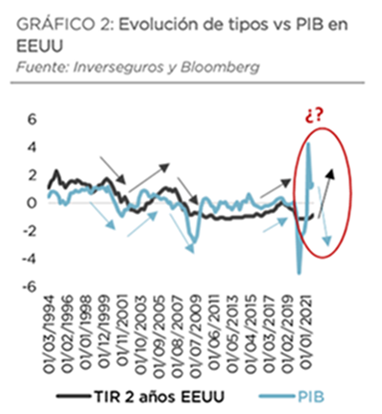 Sin embargo, no podemos esperar que este rápido crecimiento de la demanda nominal se ralentice hasta el 4%, aproximado, que es compatible con un crecimiento económico potencial y una inflación en el entorno, ambos, del 2% anual. El crecimiento de la demanda nominal es muy superior al de los tipos de interés. No sólo ha alcanzado tasas que no se veían desde la década de 1970, sino que la brecha con el tipo de interés a diez años es mucho mayor que entonces.