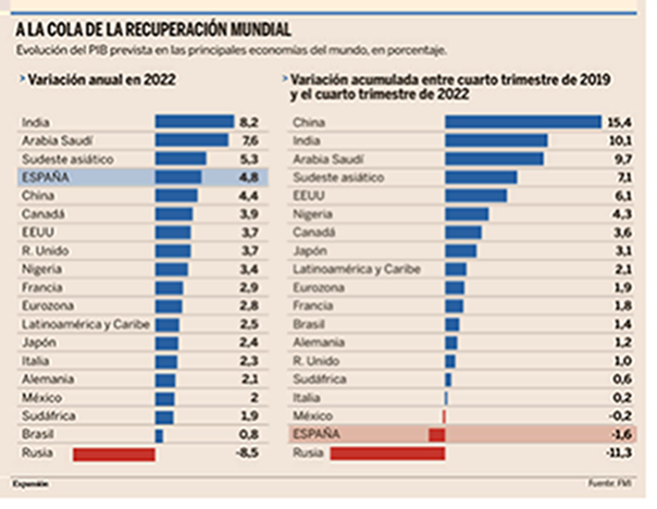 Sin embargo, el frenazo ha sido generalizado, también en aquellos países que siguen creciendo, aunque sea tímidamente, como sucede en la mayor parte de las economías. De los 28 países para los que se dispone de datos, apenas seis ganan impulso en los últimos tres meses. Se trata de Portugal, Austria, Hungría, Letonia, México y Alemania. No obstante, hay que tener en cuenta que se trata de casos excepcionales, ya que la tendencia general es a la baja, y que son economías con un peso muy escaso en la economía global, con la gran excepción de Alemania. Sin embargo, la locomotora europea apenas crece un 0,2%, insuficiente como para compensar el retroceso del 0,3% achacable a la variante Ómicron al cierre del año pasado. y apenas seis países mantienen un avance igual o superior al 1,2%, que era la tónica general hasta el año pasado, encabezados por Portugal (2,6%) y Austria (2,5%).