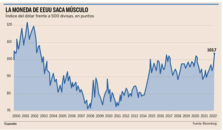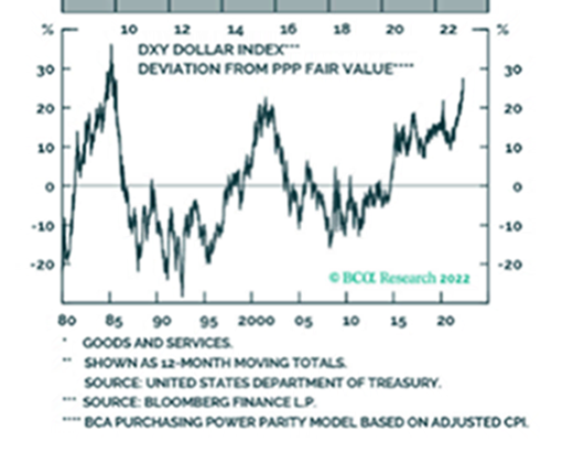 El DXY (Us Dollar Index) cotiza a estos precios con un 27% de prima vs PPP (Purchasing Power Parity) según BCA Research.