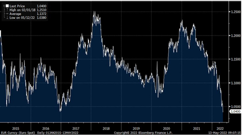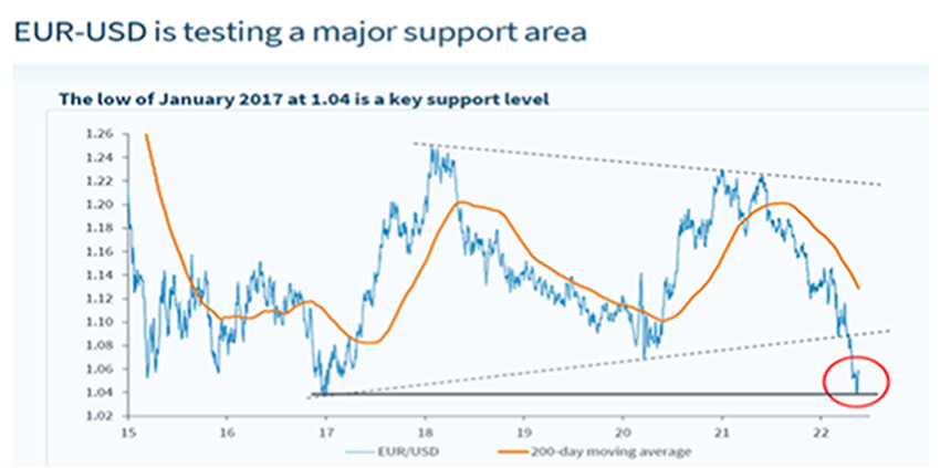De ahí que esta semana estemos viendo un rebote del euro desde ese soporte del 1,04, aunque el 12 de Mayo hizo un mínimo de 1,038 no terminó de romper ese suelo con claridad.