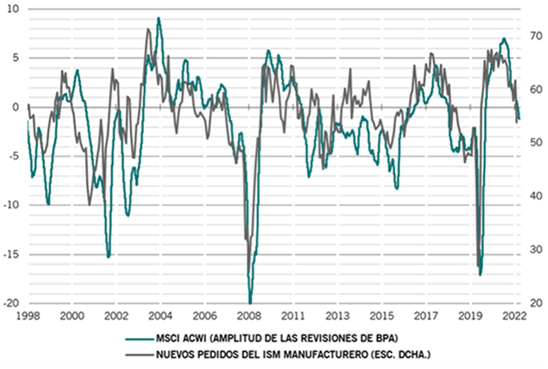 Esta semana, desde el punto de vista macroeconómico, lo más importante en Europa fueron los PMIs que se publicaron el martes, se publicaron los PMI preliminares de mayo, registrando un deterioro generalizado: en la Eurozona, compuesto (54,9 vs 55,1e vs 55,8 anterior), manufacturero (54,4 vs 54,7e vs 55,5 anterior) y de servicios (56,3 vs 57,4e vs 57,7 anterior); en Alemania, compuesto (54,6 vs 53,9e vs 54,3 anterior), manufacturero (54,7 vs 54e vs 54,6 anterior) y de servicios (56,3 vs 57,1e vs 57,6 anterior); en Francia, compuesto (57,1 vs 56,9e vs 57,6 anterior), manufacturero (54,5 vs 55,2e vs 55,7 anterior) y de servicios (58,4 vs 58,5e vs 58,9 anterior); en Reino Unido, compuesto (51,8 vs 56,5e vs 58,2 anterior), manufacturero (54,6 vs 55e vs 55,8 anterior) y de servicios (51,8 vs 57e vs 58,9 anterior). En EE.UU. también se publicaron cifras del PMI preliminar de mayo, también con retrocesos respecto al mes anterior: compuesto (53,8 vs 55,7e y 56 anterior), manufacturero (57,5 vs 57,7e vs 59,2 anterior) y de servicios (53,5 vs 55,2e vs 55,6 anterior).