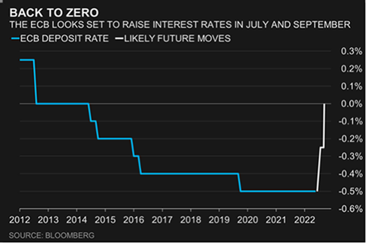 Este lunes la presidente del Banco Central Europeo, Christine Lagarde , anunció que el BCE subirá tipos por primera vez desde el 2011 en Julio y otra segunda vez en Septiembre. Lagarde indicó que la política monetaria seguirá ajustándose hasta alcanzar el “tipo de interés neutral”. Bloomberg Economics estima que ese tipo de interés neutral para la zona euro está en el 1,5%. Bloomberg Economics espera que el BCE suba los tipos 25 puntos básicos en Julio otros 25pbs en Septiembre y otros 25pbs en Diciembre. “I expect net purchases under the APP to end very early in the third quarter. This would allow us a rate lift-off at our meeting in July, in line with our forward guidance. Based on the current outlook, we are likely to be in a position to exit negative interest rates by the end of the third quarter.»