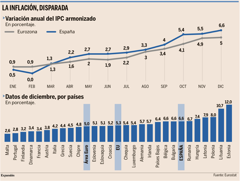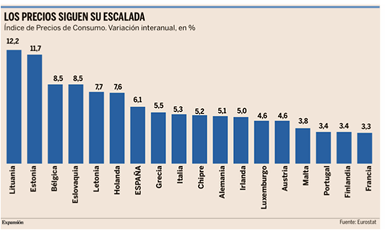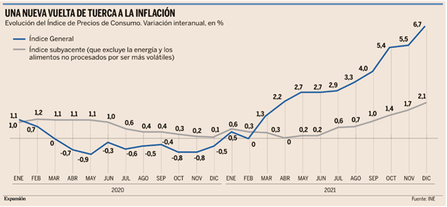 En Europa ayer se confirmó el alza del IPC general al +5,9% interanual (frente al +5,1% anterior) principalmente por la energía, pero ya todos los sectores suben precios de forma generalizada y la subyacente escala al +2,9% interanual (frente al 2,4% anterior).