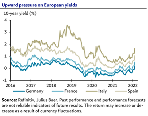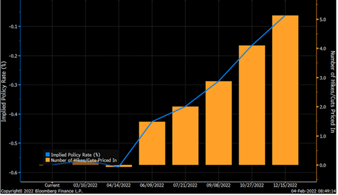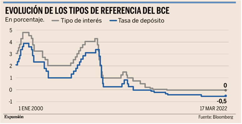 Los mercados descuentan que la tasa de depósito llegará al 0% en diciembre en Europa, lo que se traduciría en cinco subidas antes del final de año (o tres de mayor calibre). El precio del dinero, siguiendo este posicionamiento, debería subir ya este julio en el primer movimiento al alza en los últimos 11 años.