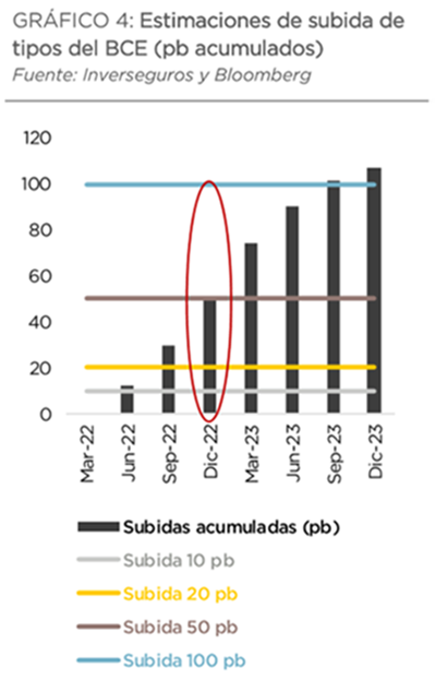 Adicionalmente, al BCE no le va a quedar más remedio, al ejecutar la Fed ese conjunto de subidas, porque si la Reserva Federal sube tipos con esa intensidad y el BCE no hace nada, la zona euro puede empezar a tener problemas para financiarse frente a la zona dólar, ya que los inversores irán a esta última en busca de una mayor y más apetecible rentabilidad.