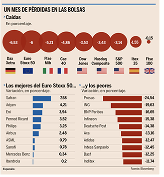 Las bolsas cerrarán la semana con subidas lideradas por Europa (el IBEX sube un 2,5% en la semana pese a la caída del 1% de hoy) en la cuarta semana de la invasión de Ucrania. El ataque ruso a civiles ha enquistado las negociaciones entre ambos bandos, que no obstante continúan. Mientras, Estados Unidos reitera su apoyo a Ucrania con armamento de defensa, insistiendo en que el conflicto será largo y sin descartar el uso de armamento nuclear desde Rusia. Hoy mismo se reúnen los líderes estadounidense y chino, en donde es previsible que Biden le recuerde a Xi Jinping que el apoyo bélico de Pekín a Moscú traerá consigo importantes sanciones económicas.