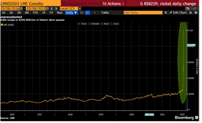 Esta semana también era noticia el níquel, que reanudaba la cotización en el mercado de materias primas de Londres, tras una semana sin poder cotizar, tras subir un +250% hace dos semanas, lo que llevó a la imposibilidad de poder aumentar las garantías, por parte del principal tenedor de futuros en esta plaza (la metalúrgica china Xiang Guangda, que tuvo que ser respaldada con crédito concedido por las autoridades chinas y JP Morgan). El níquel se estrenaba con una caída de un -5% y volvía a forzar a la Bolsa de Metales de Londres a detener de nuevo su cotización por volatilidad, enfureciendo a los principales brokers que participan en esta plaza por este grave problema de iliquidez que pone en duda el buen funcionamiento de este mercado.