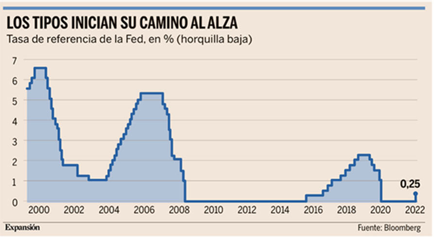 La Reserva Federal ha intensificado el giro ya anunciado hace meses hacia una política monetaria restrictiva. Si hasta ahora había anunciado tres subidas de tipos de un cuarto de punto en 2022, este miércoles ha subido los tipos 25 puntos básicos –situándolos entre el 0,25% y el 0,50%– y ha anunciado otras seis subidas más a lo largo del año –que llevarán los tipos al entorno del 2%–, lo que muestra la clara preocupación de la Reserva Federal por los momentos inflacionistas que vivimos. Es más, su previsión es que los tipos sigan incrementándose a lo largo de 2023, hasta llegar a un nivel cercano al 3%, con mantenimiento posterior, ceteris paribus. Todo ello si la inflación no siguiese descontrolada tras las primeras subidas, porque de suceder esto las subidas entonces podrían ser más agresivas.