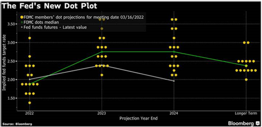 El llamado diagrama de puntos (Dot Plot) de la Reserva Federal que el banco central usa para señalar su perspectiva para el camino que tomen los tipos, señala que los miembros del comité esperan aumentar los tipos seis veces más este año.