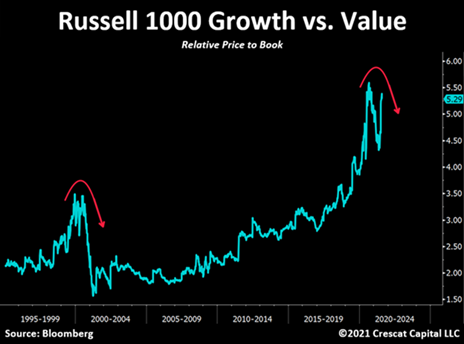 Según un análisis de la firma Crescat Capital los repuntes de inflación llevarán de nuevo a una “gran rotación” que hará que los inversores vendan los sectores y compañías más sobrevaloradas “growth” y compren sectores y compañías más infravaloradas y la gestión “value”.