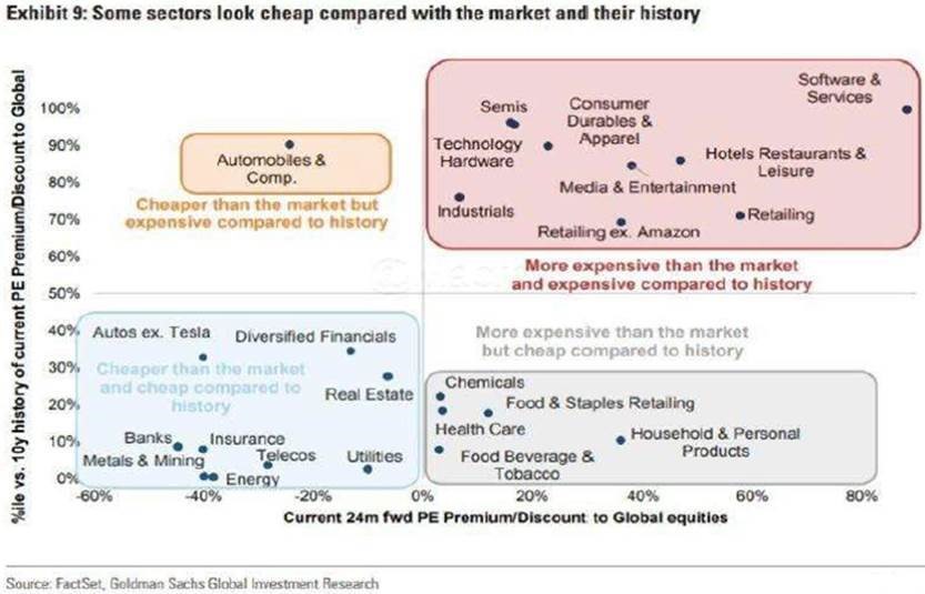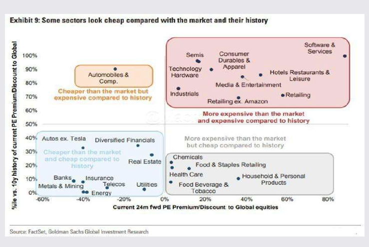 Del informe mensual de ACACIA Inversiones rescato un gráfico que me parece muy interesante, en el cuadrante inferior izquierdo (azul) observamos sectores que presentan valoraciones atractivas frente a su historia reciente y frente al mercado:
