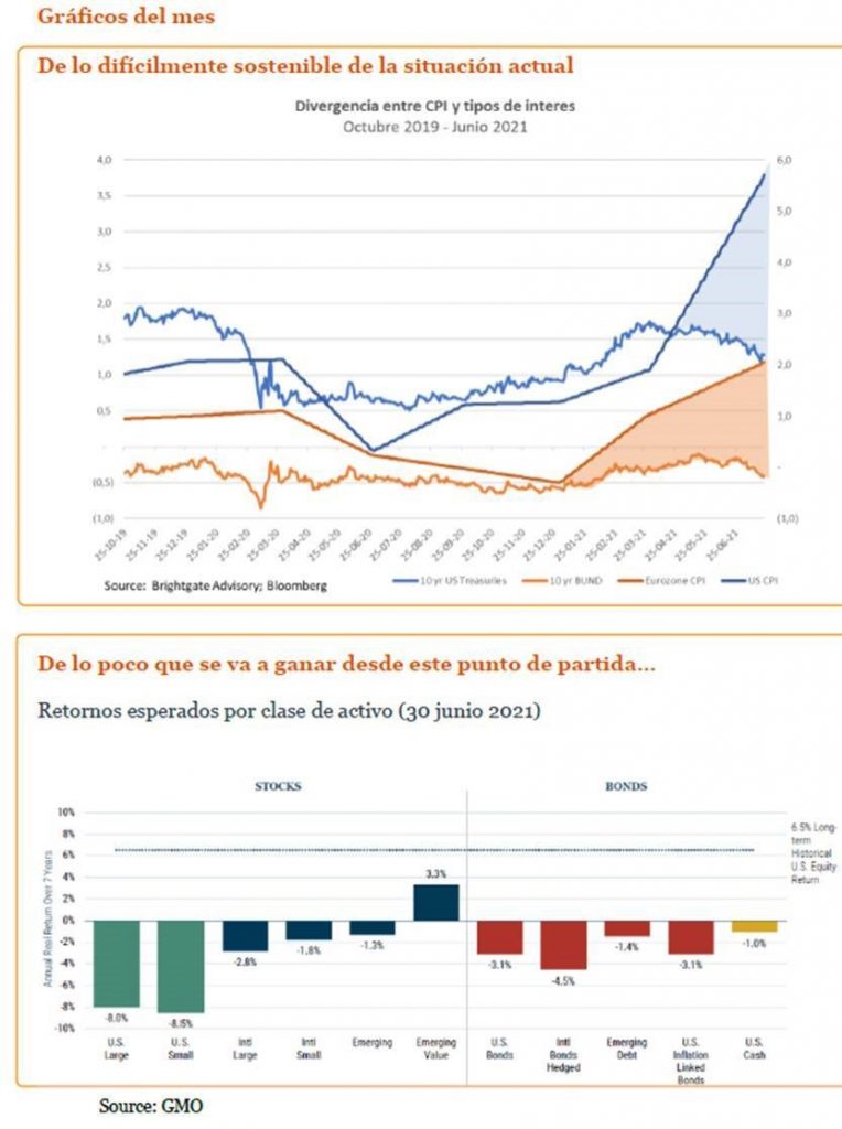 Incluso suponiendo que realmente la inflación sea transitoria, el daño de la inflación sobre los salarios y el ahorro es innegable. Es difícil justificar un mantenimiento de los tipos de referencia de corto plazo al 0% en EE.UU. y negativos en la Eurozona. El gran peligro actual reside en que el aumento de la inflación se traslade a los salarios y esto, a su vez, provoque subidas adicionales de precios que desemboque en una espiral inflacionista.