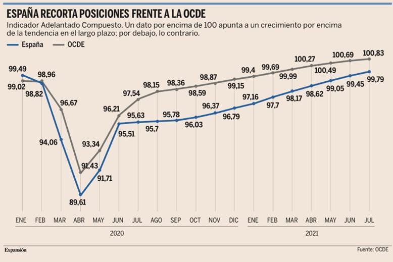 España sigue atravesando la crisis del coronavirus con el pie cambiado, aunque esta vez, para bien. El país es la gran economía desarrollada que más se acelera en el último mes, de acuerdo con los indicadores adelantados de la Organización para la Cooperación y el Desarrollo Económicos (OCDE), algo que contrasta con el resto de grandes economías avanzadas. Sin embargo, a pesar del avance de agosto y de los meses anteriores, España sigue por detrás de la media y ahora, además, encara una nueva incertidumbre, la de si esta aceleración se podrá mantener cuando sus principales socios comerciales y mercados turísticos están frenando.