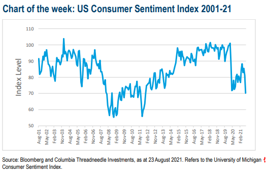 La confianza del consumidor es uno de los elementos más importantes a tener en cuenta para predecir el futuro de una economía, y en las economías desarrolladas el consumo viene a representar unos dos tercios del PIB. En EEUU, se descontó la desaceleración provocada por la variante delta gracias a la abrupta caída que la confianza del consumidor sufrió durante agosto. Así, la confianza del consumidor medida semanalmente por la Universidad de Michigan bajó de niveles de 90 a niveles de 70, inusualmente bajos, y algo parecido ocurrió con la confianza medida mensualmente por el Conference Board.