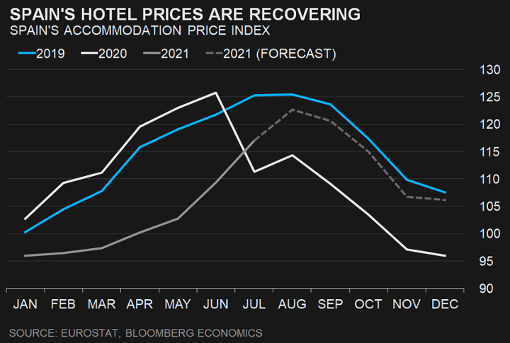 Spain’s inflation rebounded strongly in July, as the very unusual drop in hotel prices recorded at the same time last year was not repeated. We forecast some upward pressure from energy costs and a further recovery in hotel prices will drive the headline rate to 3.1% from 2.9%. As the pandemic hammered Spain’s tourism industry, prices for accommodation fell sharply in July 2020 and remained around 10% below levels seen in the same month of 2019 for most of last year. But with travelers returning in greater numbers, prices rebounded last month to 6% below their July 2019 level, contributing 0.4 ppt to the rebound in inflation. We expect they will continue to recover and support inflation in the coming months, albeit at a slower pace. We also anticipate some increase in both electricity costs and fuel prices to put further upward pressure on headline inflation in August.