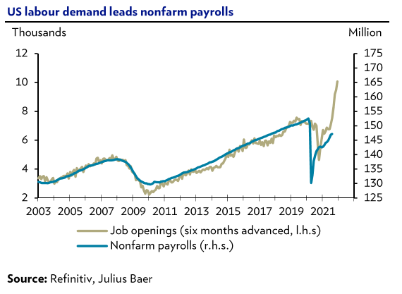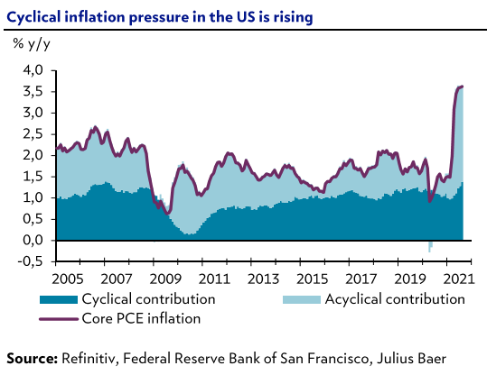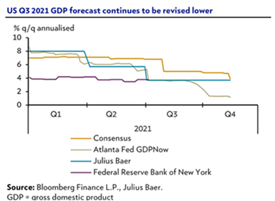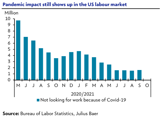 Perspectivas económicas de Estados Unidos, según Julius Bäer una inflación más alta de lo esperado en septiembre, junto con un menor crecimiento estimado para el tercer trimestre, parecerían empezar a dibujar un cuadro de estanflación. Sin embargo, es difícil justificar un estancamiento económico en Estados Unidos, dada lo robusto de la demanda y los elevado de las intenciones de contratación e inversión en capital fijo. El crecimiento se ha frenado debido a los cuellos de botella, no a la falta de demanda y la consecuencia directa es el mayor precio de los bienes y servicios cuya oferta es escasa. La expansión de la oferta en los próximos meses contendrá los precios y, por el momento, los salarios no suben más que la productividad y el crecimiento del crédito es moderado.