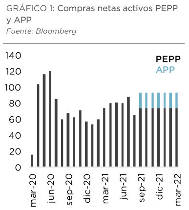 Estos debates vienen a reforzar la hoja de ruta trazada por Powell por la que contempla que la Fed finalice por completo su programa de compras para mediados del año que viene. Al ritmo barajado en las actas de la última reunión y –si el descenso comenzara a mediados de noviembre y no más tarde– la institución monetaria de EEEU abandonaría las compras netas de deuda alrededor de julio de 2022.
