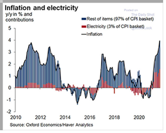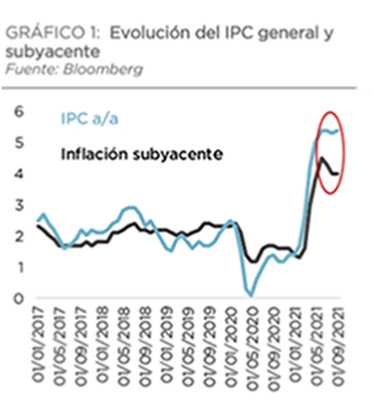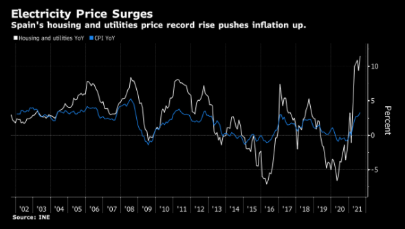Ayer se confirmó el alza de la inflación española al +4% interanual, impulsada en primero lugar por los precios de la energía, ampliando la diferencia con el aumento de la subyacente, que sigue en un moderado +1%, aunque empiezan a verse signos de despertar de los precios de servicios y en mayor medida, de los bienes de consumo manufacturados, reflejando la escalada mundial de los precios industriales.